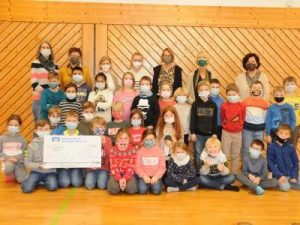 Die Mädchen und Buben der Mittags- und Ganztagsbetreuung an der Grundschule Erkheim haben mit Betreuerinnen in der Vorweihnachtszeit wieder einen Flohmarkt abgehalten. Schüler geben dafür nicht mehr benötigte Bücher, Spielsachen und andere Gegenstände ab, die Mitschüler dann für einen geringen Betrag kaufen können. Diesmal kamen 1.000 Euro als Spende für das Projekt „MeWaiKi“ (Memmingen und das Unterallgäu hilft Waisenkindern am Kilimandscharo) zusammen. Das Bild zeigt die Mädchen und Buben bei der Scheckübergabe mit (hinten, von links) Kathrin Rück, Cordula Schrinner, Evelin Zeitner, Franziska Michl, Lehrerin Petra Schmolinsky (Mitarbeiterin beim MeWaiKi-Projekt), Renate Kiefer und Rektorin Sabine Hummel. kmi/Foto: Karl Michl