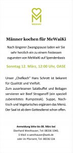 Zum 2. Mal übernahmen Männer die Küche der OASE, um ein attraktives Menü zu „zaubern“. Dieses Mal unterstützt von Frau Marianne Westhauser. Was uns besonders freute, war das große Interesse am festlichen und vielseitigen Menü. Über 80 Personen wollten dabei sein, „um sich und den Witwen und Waisen am Kilimandscharo etwas Gutes zu tun“.