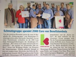 Die Schmotzergruppe des Fischertagsvereins sind die Männer, die nach dem Fischen den Memminger Stadtbach wieder sauber machen. Dieses ehrenamtliche Engagement ist einmalig und die Gruppe ist bekannt für ihre Kreativität und ihren Einfallsreichtum. Dazu zählt auch eine Tombola, die immer vor dem Fischertag abgehalten wird und großen Anklang findet. Dieses Mal betrug der Erlös 2.000 €. Die Hälfte spendeten die Schmotzer an MeWaiKi. Dafür unseren allerherzlichsten Dank!